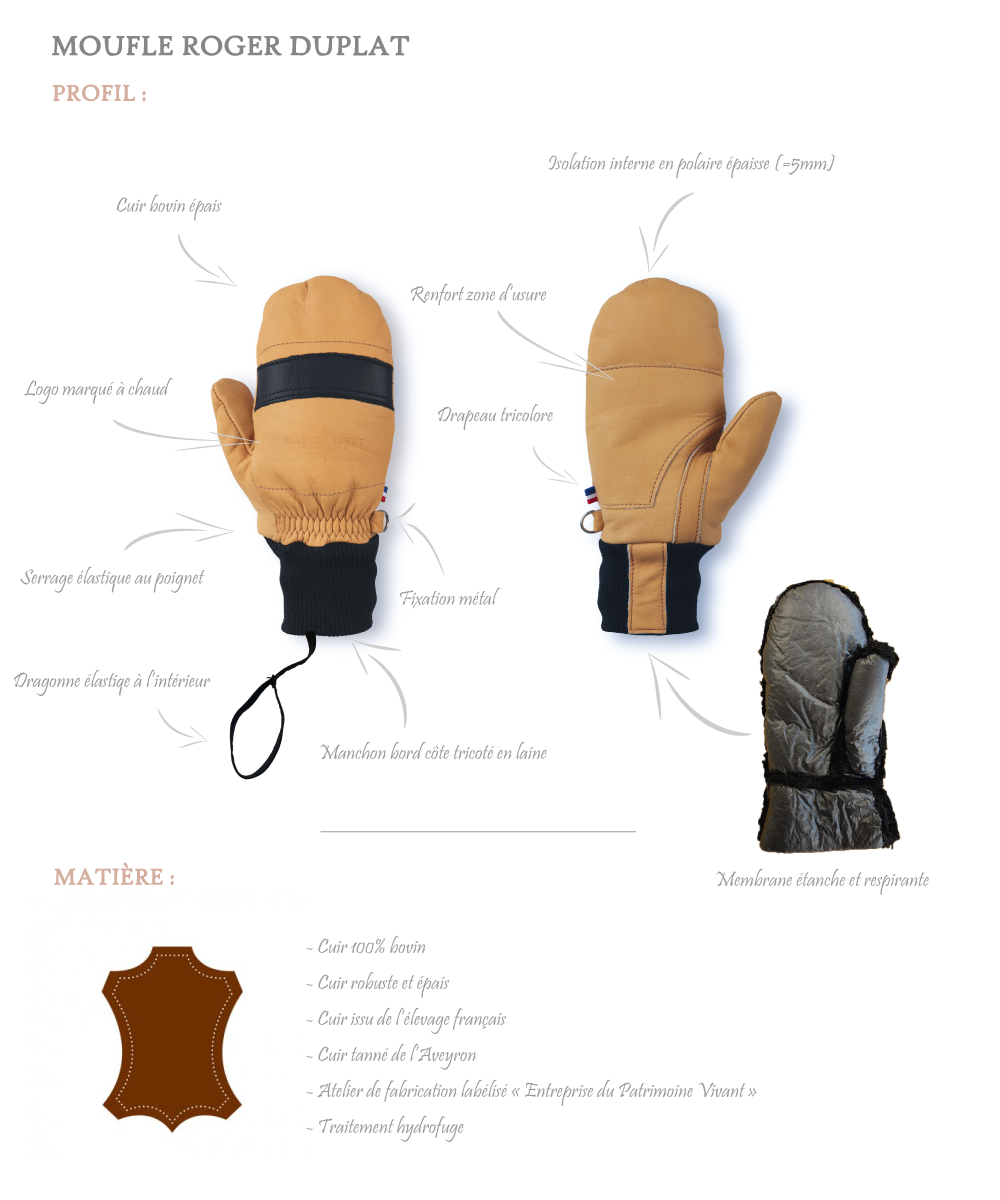 Cette moufle dessinée en hommage à Roger Duplat, est une déclinaison de la moufle historique utilisée par les alpinistes français en 1951.