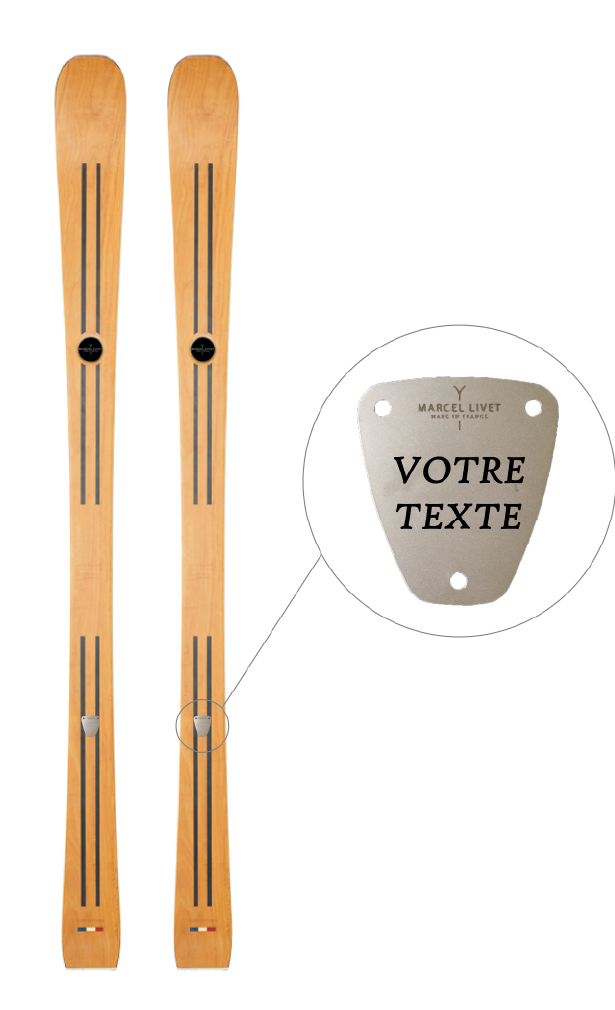 La personnalisation prend la forme d’un médaillon en acier inoxydable, de dimensions 40 x 35 mm, poli puis gravé de votre texte à Annecy. Il est ensuite monté et vissé à la main sur les skis lors de la préparation de votre commande.